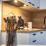 Værelserne på Przytulne Mieszkanie W Centrum har udsigt over den indre gårdhave og har et påklædningsområde, kaffe- og tefaciliteter, et skrivebord. Nogle enheder inkluderer en terrasse at slappe af på. Badeværelsesfaciliteter indeholder separat toilet og en bruser.